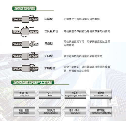 直螺紋連接套筒適用于建筑工程中鋼筋機(jī)械連接,主要連接Φ12-Φ50mm的HRB335、HRB400及HRB500普通熱軋帶肋鋼筋。